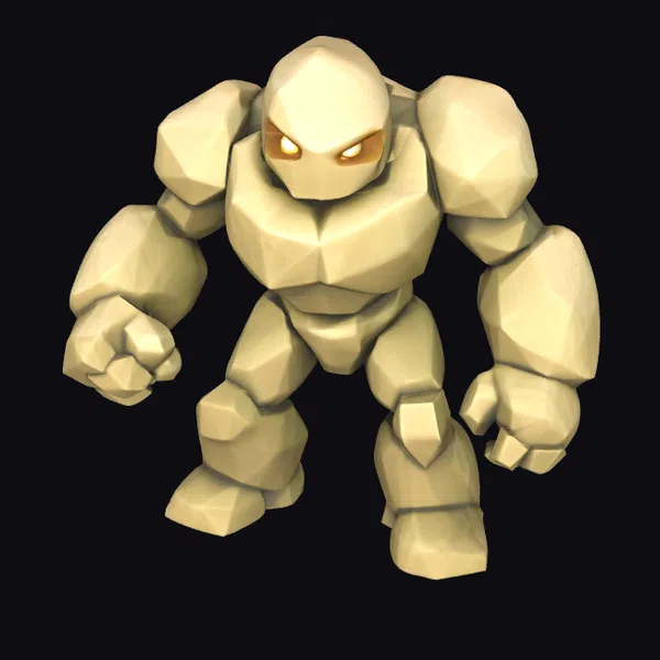 Crafted with meticulous attention to detail, this stone golem model showcases a robust, humanoid form composed of large, polygonal stone-like segments. Its facial features are minimal yet striking, with glowing orange eyes that seem to pierce through the darkness. The golem’s posture, with fists clenched and legs slightly bent, suggests a state of alertness, as if ready to spring into action at a moment’s notice. The stylized, low-poly art style lends the model a unique, cartoonish charm, making it an excellent choice for projects requiring a blend of fantasy and ancient mystique. Its beige and gray coloration adds to its stone-like appearance, grounding it in a sense of earthy realism. This model would be perfect for use in games, animations, or virtual reality experiences where a fantastical, mythical creature is needed.