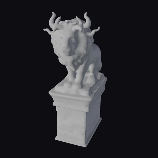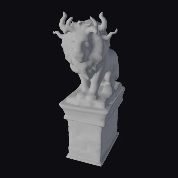 Positioned dynamically on a brick-textured pedestal, the lion’s body is captured in a poised stance, as if ready to spring into action. The statue’s surface exhibits a rich, weathered texture, with subtle hints of green patina that suggest age and character. The lion’s mane is meticulously detailed, with each strand individually crafted to convey a sense of movement and vitality. Two imposing horns protrude from the lion’s head, adding a touch of mystique to its already commanding presence. The pedestal itself is adorned with ornate carvings, enhancing the overall aesthetic of the piece. This model is perfect for use in games, 3D printing, VR/AR experiences, animation, and design projects, where a touch of historical and mythological flair is desired.