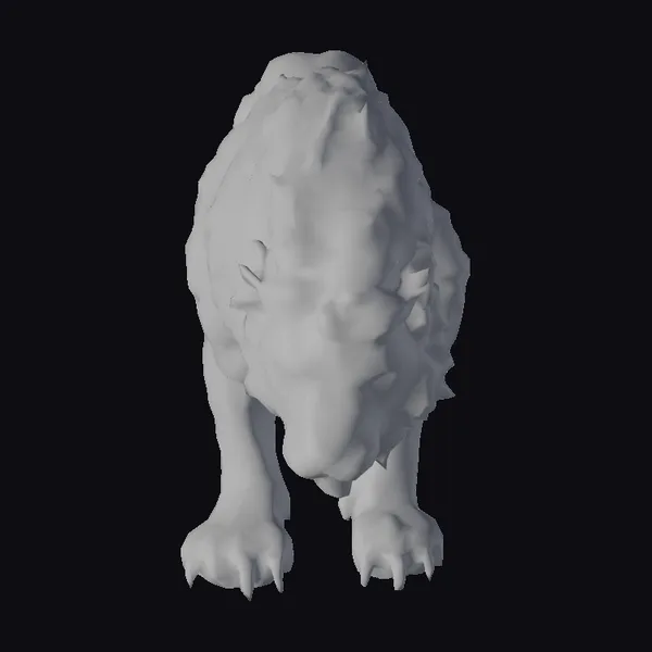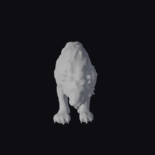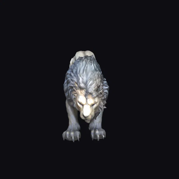 Positioned in a low, aggressive stance, the stone lion’s body is a masterclass in detailed modeling. Its fur, rendered in varying shades of gray, appears almost lifelike, with each strand meticulously sculpted to create a sense of movement and vitality. The eyes, though not colored, seem to gleam with a fierce inner light, accentuating the lion’s powerful build and sharp, outstretched claws. The texture of the stone is captured beautifully, suggesting a weathered, aged appearance that adds to the statue’s mystique. This model is perfect for use in games, 3D printing, VR/AR experiences, animation projects, or architectural designs where a touch of wild majesty is desired.