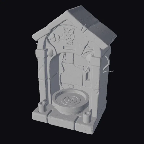 Nestled within a sturdy stone framework, a beautifully rendered owl statue takes center stage, its wise eyes seeming to survey the surroundings from its perch atop a rustic arch. The shrine’s sloping roof and intricately carved walls evoke a sense of ancient mystique, while the gentle water feature within the circular basin below adds a soothing ambiance. The beige stone used throughout the structure lends an air of earthy elegance, making this model perfect for use in games, 3D printing, VR/AR experiences, animation, or design projects where a touch of mysticism and decor is desired.