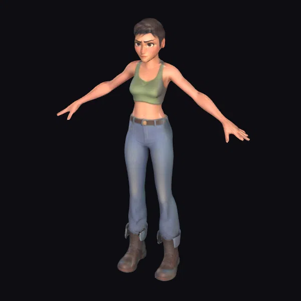 Detailed with precision, this stylized 3D model of a strong female hero showcases a dynamic A-Pose stance, emphasizing her readiness for action. Her short brown hair is styled neatly, framing a face set in a resolute expression. The model’s attire consists of a green sports bra that highlights her toned physique, paired with blue jeans and brown boots that suggest a practical yet adventurous spirit. The pixar-inspired digital painting style brings a vibrant, animated feel to the character, making her suitable for various applications, including game development, animation projects, and virtual reality experiences. Her robust build and fearless posture make her an ideal character for stories or games requiring a strong, capable female protagonist.