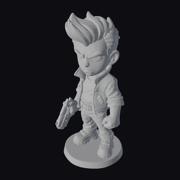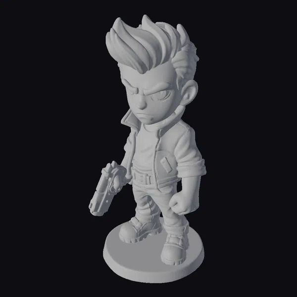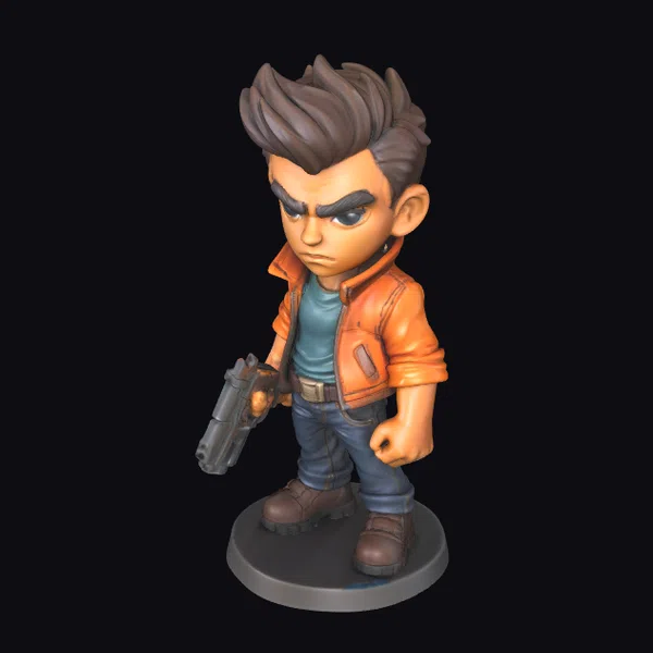 This stylized hero figurine stands poised, with a determined expression set on his face. He wears a bright orange jacket over a blue shirt, paired with jeans and brown boots, giving him a casual yet heroic appearance. His dark hair is styled in a spiky fashion, adding to his edgy look. The hero holds a gun in his right hand, while his left fist is clenched, conveying a sense of readiness and strength. The detailed textures and vibrant colors bring this character to life, making him suitable for various applications such as games, animation, print, VR/AR experiences, and design projects. His unique style and confident demeanor are sure to capture attention.