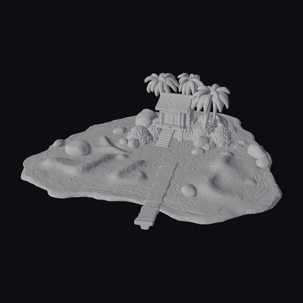 Imagine yourself standing on the sun-kissed shores of a tranquil island, surrounded by crystal-clear waters and vibrant greenery. This stylized low-poly 3D island map boasts a picturesque sandy beach coastline, dotted with large gray rocks and boulders. A small wooden pier stretches into the turquoise sea, inviting you to explore the island’s secrets. The island’s interior features a quaint brown hut with a reddish-brown roof, accompanied by three palm trees swaying gently in the breeze. The lush green bushes and trees add a pop of color to the scene, creating a sense of depth and texture. Perfect for use in games, animations, or architectural visualizations, this 3D model is sure to transport your audience to a tropical paradise.