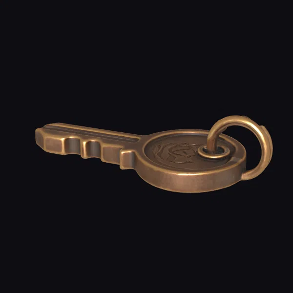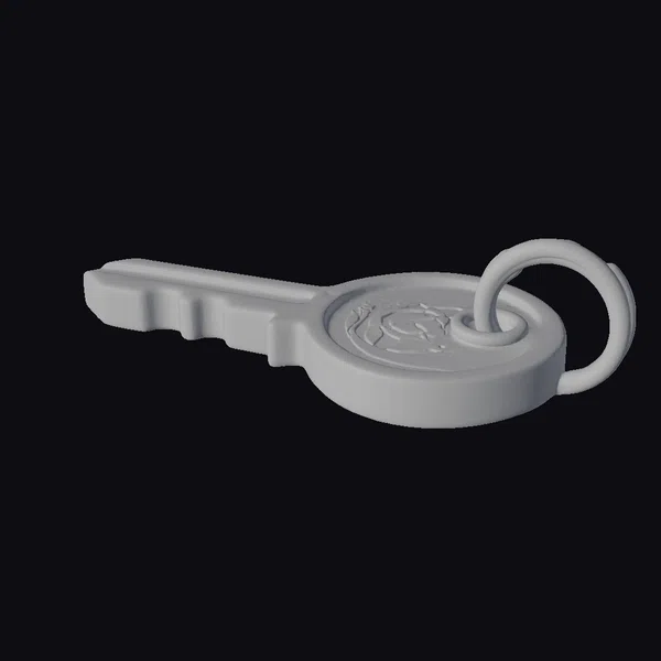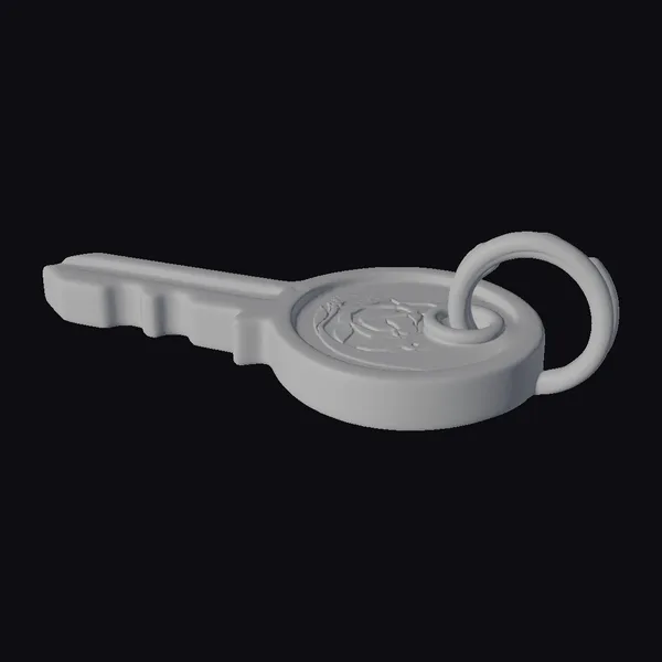 Positioned dynamically against a pure white backdrop, the key pendant showcases its intricate details. The golden key’s teeth are prominently displayed on the left, while the circular base features a raised symbol at its center. A small loop connects the key to a larger ring, perfect for attaching to a chain. The stylized design and metallic texture suggest a blend of ancient and mystical influences. This key pendant is perfect for use in games, 3D printing, VR/AR experiences, animation projects, or design visualizations where a touch of mystique is needed.