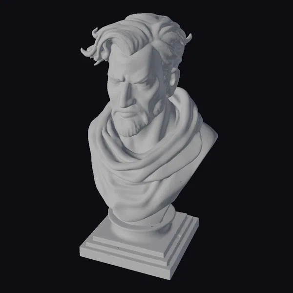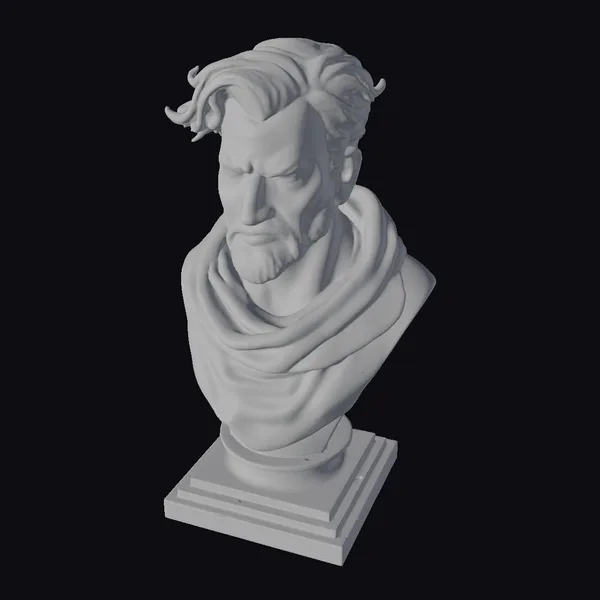 This stylized bust presents a male character with a solemn, almost brooding expression, achieved through a masterful blend of angular facial features, deep-set eyes, and wavy dark hair that seems to be subtly tousled. The character’s gaze is directed downwards, adding an air of introspection. A vibrant red scarf dramatically contrasts with the darker tones of the hair and the base, drawing attention to the subject’s upper body. The bust itself is mounted on a sturdy black base, enhancing its presence. The detailed textures and the play of light on the scarf contribute to a dynamic visual effect. This model is well-suited for use in games, 3D printing, VR/AR experiences, animation, and design projects where a character with a deep, contemplative mood is needed.