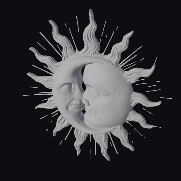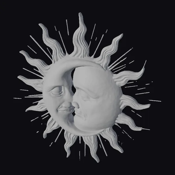 In a mesmerizing display of cosmic unity, a stylized sun and moon share a tender moment, their faces gently touching. The sun, bathed in a warm golden hue, radiates life and energy with its vibrant beams extending outward, while the moon offers a calm, serene contrast with its gentle gray surface. Crafted with meticulous attention to detail, this piece showcases smooth textures and a harmonious blend of light and shadow. Ideal for projects seeking a touch of mythological elegance, it can be used in game development, animation, VR/AR experiences, and architectural visualization to add a symbolic, otherworldly charm.