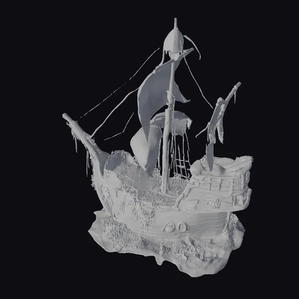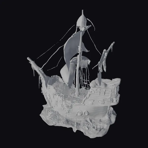 Perched on a base of rugged, coral-encrusted rock, the shipwreck’s hull lies partially buried, as if the sea is slowly reclaiming it. The wooden planks are weathered to a soft gray, with hints of brown and green from the seaweed and moss that cling to its surface. The sails, once full of life, now hang limp and tattered, their blue-green fabric flapping gently in the ocean currents. A delicate balance of light and shadow highlights the textures of the seaweed, coral, and wooden hull, inviting the viewer to explore the intricate details. Ideal for use in games, 3D printing, VR/AR experiences, animation, and design projects, this model brings an air of mystery and adventure to any underwater scene.