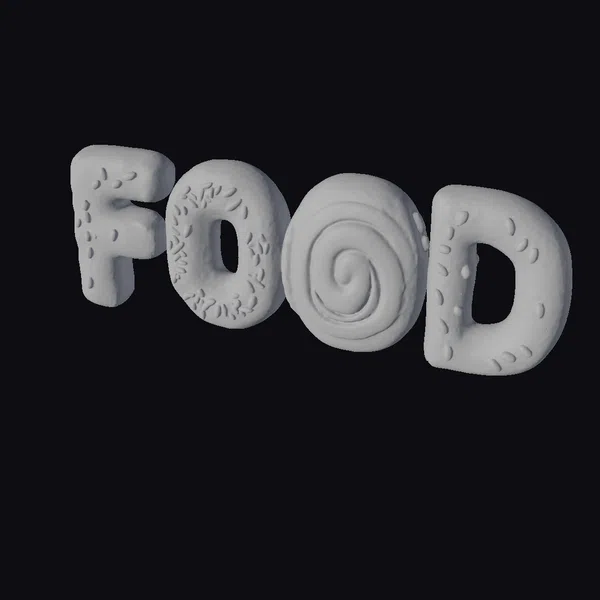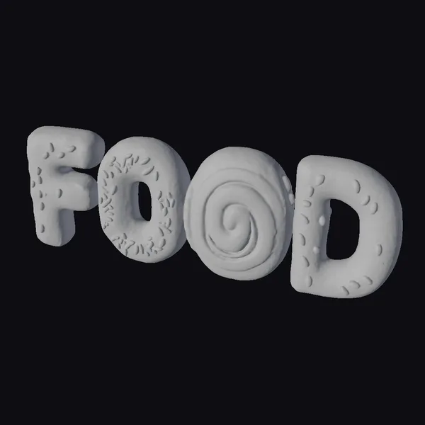 Crafted with attention to detail, this stylized 3D model showcases a creative take on the word ‘FOOD’, composed of various sweet treats. The ‘F’ is a chocolate frosted donut adorned with pink, yellow, and orange sprinkles. The first ‘O’ is a pink frosted donut with a lively mix of blue, yellow, and orange sprinkles. The second ‘O’ features a cinnamon roll with a swirl design, and the ‘D’ is a yellow frosted donut topped with chocolate chips. The model is perfect for projects requiring a playful and eye-catching representation of food. Its detailed textures, vibrant colors, and creative composition make it suitable for animations, games, and 3D printing.
