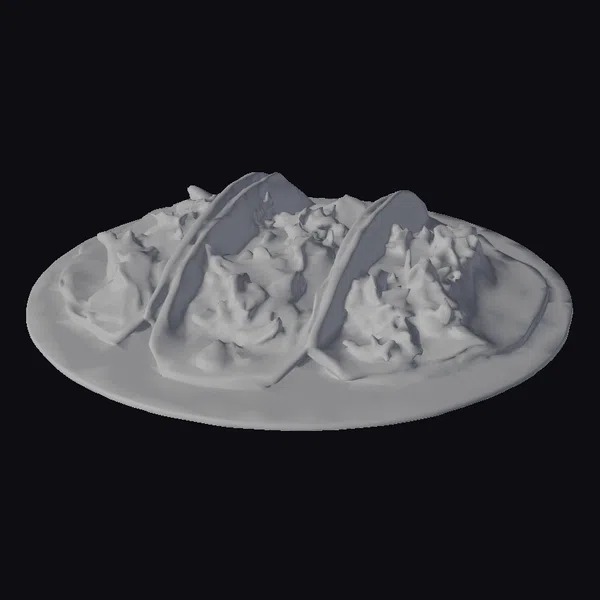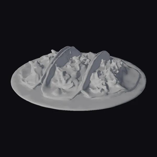 Detailed examination reveals a trio of tacos positioned on a plate with a subtle texture, suggesting a ceramic or similar material. The tacos themselves are filled with slow-cooked meat that’s rich in color and texture, indicating a tender, fall-apart consistency. A medley of vegetables adds a pop of color and freshness, while a sprinkle of herbs lends a burst of aromatic flavor. The tortillas, golden and slightly crispy at the edges, encase the fillings with a gentle fold. The lighting accentuates the moisture and texture of the ingredients, making the tacos look incredibly appetizing. This model is perfect for use in games, 3D print projects, VR/AR experiences, animations, or design presentations where a realistic food item is needed.