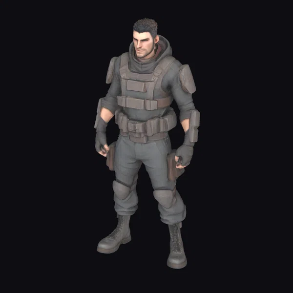 Detailed with precision, this stylized 3D model of a male game character showcases a blend of functionality and futuristic design. The character’s tactical gear includes a high-collared jacket, shoulder pads, chest armor, and multiple utility belts, all rendered in a predominantly gray color scheme with accents of darker shades for depth. His short, dark hair and focused expression add to his rugged appeal. The model’s pose, with hands resting on holstered weapons, suggests a state of alertness and readiness. This character model would be perfect for projects requiring a versatile, modern hero figure, suitable for games, animations, or virtual reality experiences.