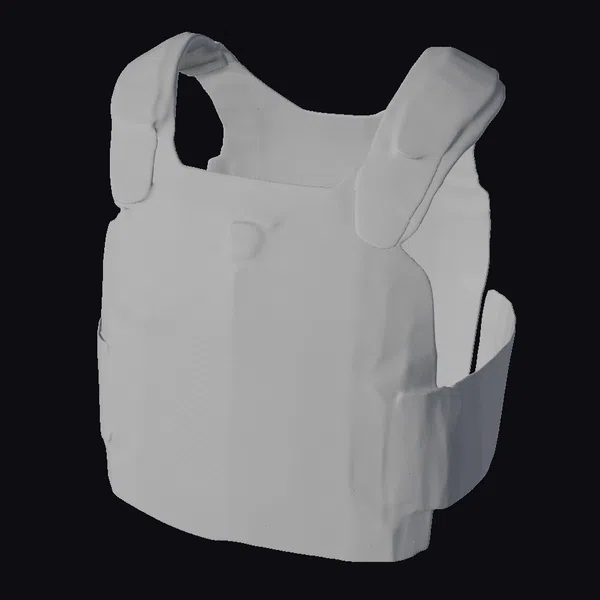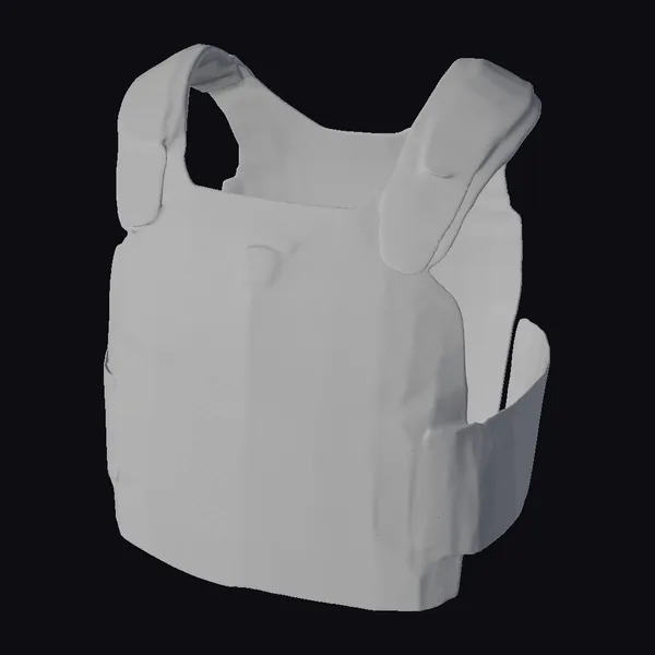 Positioned at a slight angle, the tactical vest showcases its robust design and versatile functionality. The main body of the vest is a dark gray color, with lighter gray accents on the inside and sides, suggesting a blend of materials for flexibility and protection. Two broad, padded straps sit atop the shoulders, providing support and stability. On the right side, a Velcro-fastened compartment is clearly visible, indicating the vest’s adaptability for various mission requirements. The texture of the vest is predominantly smooth, with slight creases and folds where the material bends. The overall design speaks to its use in high-stakes environments, where reliability and mobility are paramount. Ideal for use in game development, 3D animation projects, or architectural visualizations, this model brings a touch of realism and readiness to any scene.