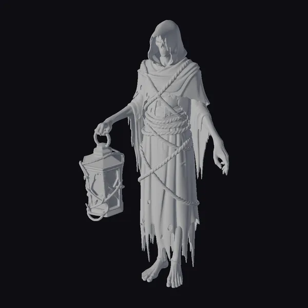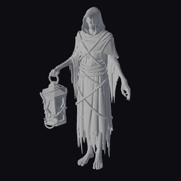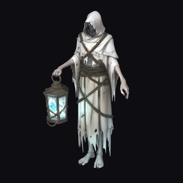 Standing with an air of mystique, the hooded figure is draped in a tattered white robe, cinched at the waist and wrists with thick, coarse ropes. The hood casts a shadow over the figure’s face, adding to the enigma. A lantern, with a soft blue glow emanating from within, is held in one hand, casting an ethereal light on the surroundings. The figure’s feet are bare, adding to the sense of vulnerability and eeriness. The intricate details of the lantern, the texture of the ropes, and the tattered fabric of the robe all contribute to a rich, immersive visual experience. This model is perfect for use in dark fantasy settings, horror scenes, or any project requiring a mysterious, otherworldly character. It can be used in games, 3D printing, VR/AR experiences, animation, and design projects.