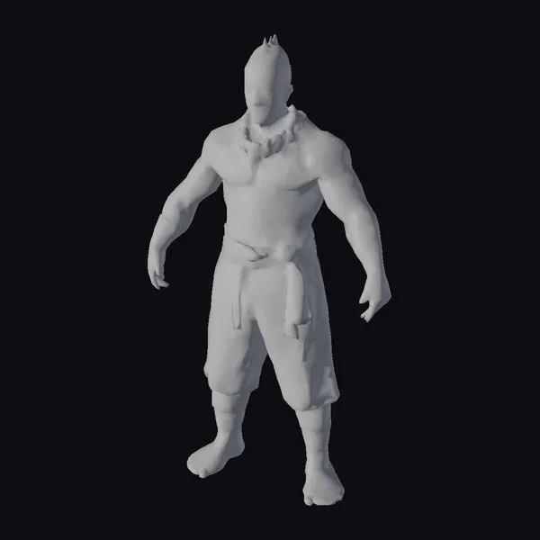 Rendered in exquisite detail, this muscular male warrior exudes an aura of raw power and ancient mystique. His robust physique is adorned with detailed tattoos on his arms, chest, and face, suggesting a rich cultural heritage. A braided necklace and a chunky pendant add to his tribal appearance, complemented by a wrapped cloth around his waist and cuffs on his wrists and ankles. The character’s intense gaze downwards, coupled with his poised stance, evokes a sense of readiness and resilience. Ideal for projects requiring a strong, realistic character, such as games, animations, or virtual reality experiences.