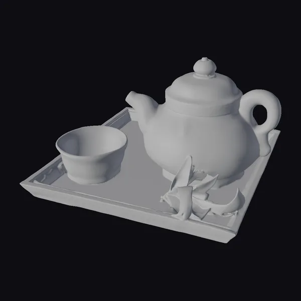 In a beautifully arranged still life, a traditional tea set takes center stage on a rustic wooden tray. The teapot, with its rounded body and delicate handle, sits poised alongside a simple ceramic cup, its interior aglow with the soft light of a tea candle. A sprinkling of fresh green leaves adds a pop of color and freshness to the scene. The entire arrangement exudes a sense of peaceful tranquility, perfect for use in designs seeking to evoke a sense of calm. The model’s realistic textures and warm color palette make it ideal for applications where a cozy, inviting atmosphere is desired, such as in interior design, animation, or 3D printing projects.