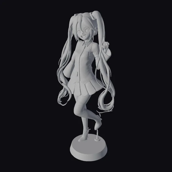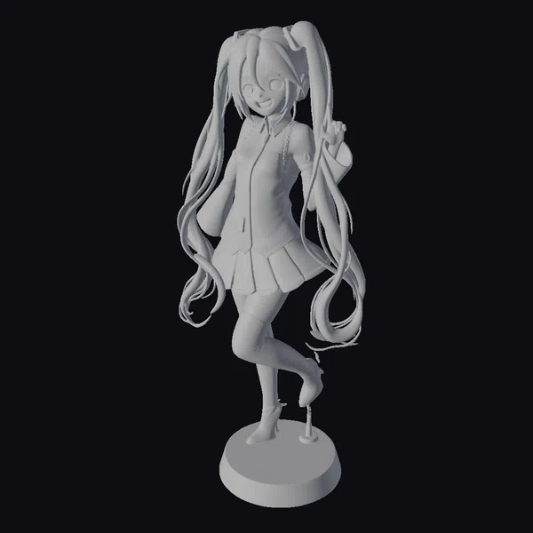 Detailed in every strand of her teal hair, this stylized anime girl figurine stands poised on a sleek black base. Her hair flows in soft, wavy lines down her back, secured in two high ponytails adorned with purple accents. Her outfit is a harmonious blend of purple and white hues, complete with a short skirt, knee-high socks, and matching boots. The girl’s facial expression is cheerful, with a slight smile and sparkling eyes. She wears headphones around her neck, suggesting a love for music. This model is perfect for use in games, 3D printing, VR/AR experiences, animation projects, and design visualizations. Its stylized features and vibrant colors make it a standout addition to any creative project.