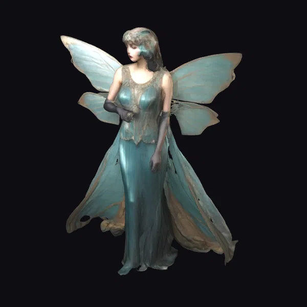 Gazing upon this teal art deco fairy is like stepping into a bygone era of glamour and enchantment. Her pose, with one hand gently touching her chest and the other at her side, conveys a sense of serene confidence. The fairy’s wings, a marvel of detailed design, stretch out behind her, their teal and gold hues catching the light. Her long, flowing gown, complemented by elegant gloves, showcases a blend of art deco luxury and mythical allure. The fairy’s headpiece, with its intricate patterns, adds a touch of vintage sophistication. This model is perfect for projects requiring a touch of fantasy and historical elegance, such as animations, games, or architectural visualizations. Its detailed features and stylized appearance make it a versatile asset for any creative endeavor.