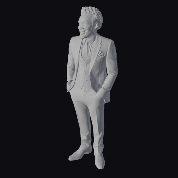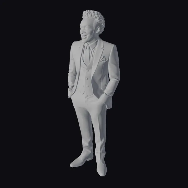 Detailed from head to toe, this 3D model showcases a man with a charismatic presence, starting with his short, curly hair and neatly trimmed beard, which frame his bright, smiling face. His teal suit, a masterpiece of texture and color, catches the light, highlighting the sharp lines of his tailored outfit. The suit’s subtle sheen suggests a luxurious fabric, while his white shirt and black tie provide a classic contrast. With hands in pockets, he strikes a relaxed yet engaging pose, suitable for a variety of applications, from animation and gaming to architectural visualization and fashion design. The model’s quality and detail make it an excellent choice for projects requiring a stylish, modern character.