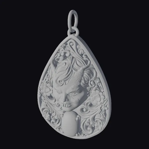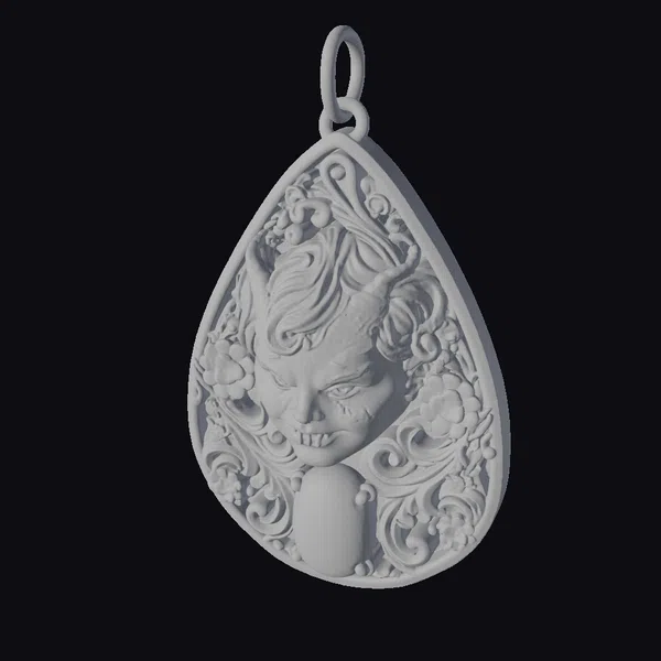 Crafted with meticulous attention to detail, this teardrop pendant boasts an ornate face at its center, rendered in a stylized manner that exudes both elegance and enigma. The face is encircled by elaborate filigree patterns that dance around it, interspersed with small beads that add a touch of texture and depth. A striking blue gemstone anchors the design at the bottom, drawing the eye and adding a pop of color. The pendant’s silver hue gives it a luxurious feel, making it a versatile accessory suitable for various occasions. Its intricate design and the contrast between the smooth face and the textured filigree create a visually captivating piece. Ideal for use in jewelry design, fashion projects, or as a standalone decorative item, this model can be utilized in 3D printing, animation, and virtual reality applications.