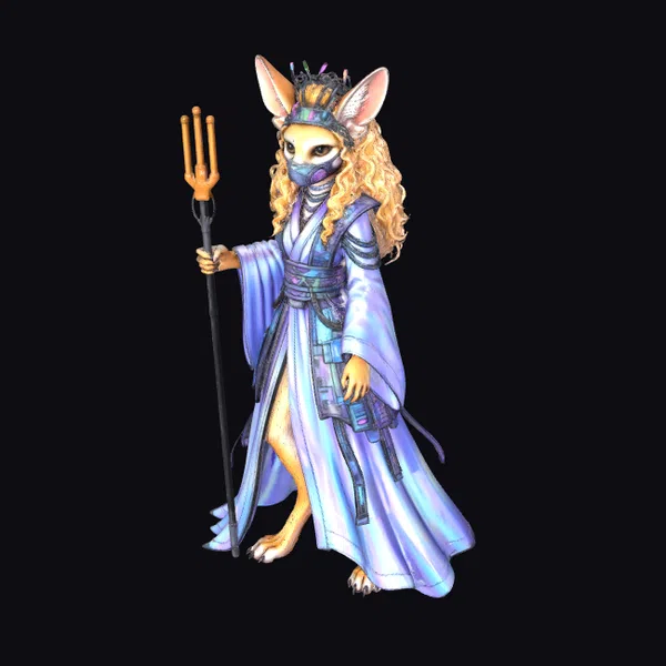 Rendered in meticulous detail, the techno canine sorceress boasts a slender yet powerful build, her canine features accentuated by large ears and sharp claws. Her long, curly blonde hair cascades down her back, complemented by a flowing purple robe with intricate blue accents and a matching mask. A futuristic crown rests atop her head, while she confidently wields a staff with a distinctive trident-like head. This stylized character model exudes a sense of mystique and power, making her a compelling addition to any 3D project, from animation and games to virtual reality experiences and architectural visualizations.