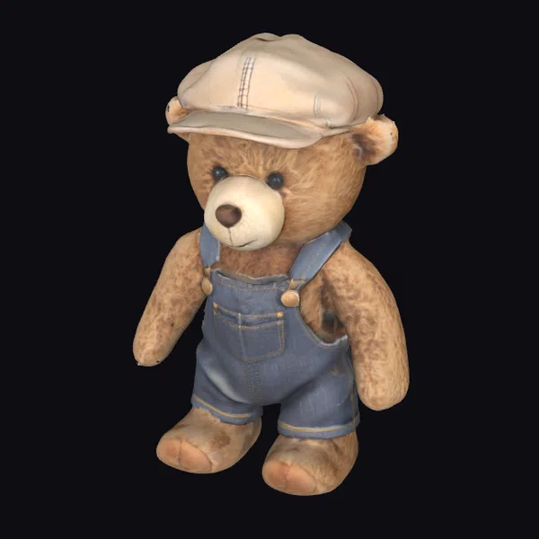 Standing confidently with its arms relaxed by its sides, this teddy bear model showcases intricate details such as the texture of its fur, the stitching on its denim overalls, and the soft, rounded edges of its cap. The overalls are adorned with yellow stitching and buttons, while the bear’s face features a gentle smile and dark, shiny eyes. Ideal for use in animations, games, or as a decorative element, this model brings a touch of whimsy and friendliness to any scene. Its stylized yet realistic appearance makes it versatile for various applications, from children’s content to design projects requiring a playful character.