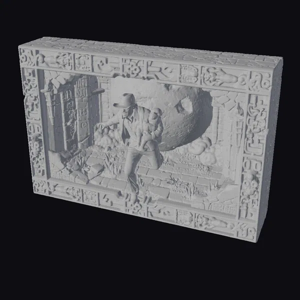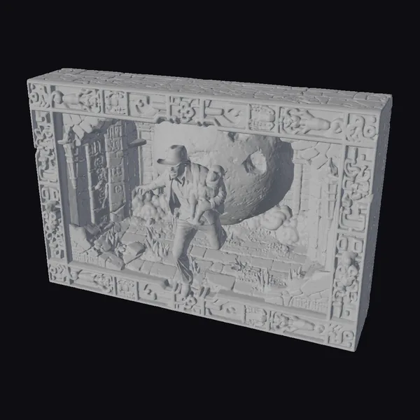 In a dynamic pose, the adventurer leaps through a temple entrance, his fedora clutched in one hand and the golden idol secure in the other. The relief sculpture boasts a richly textured, golden finish, with ornate carvings framing the scene. The temple’s crumbling walls and debris-filled floor add to the sense of urgency and adventure. This model is perfect for games, animation, or as a unique decorative piece. Its stylized design and attention to detail make it an excellent choice for those seeking a touch of excitement and mystery.