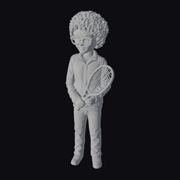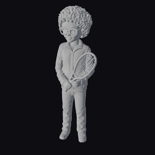 Detailed with precision, this cartoon-style tennis player figurine stands poised, clutching an orange tennis racket in both hands. His curly hair and black glasses add a touch of personality, while his black tracksuit with red accents and white shoes provide a sporty yet casual look. The figurine’s bright smile and slight lean forward suggest a moment of anticipation, as if he’s about to serve. The level of detail in the pose, textures, and accessories makes this model suitable for various applications, including game development, animation projects, and print-on-demand products. The model’s design focuses on capturing a lively, youthful spirit, making it a great addition to any sports-themed collection or project.