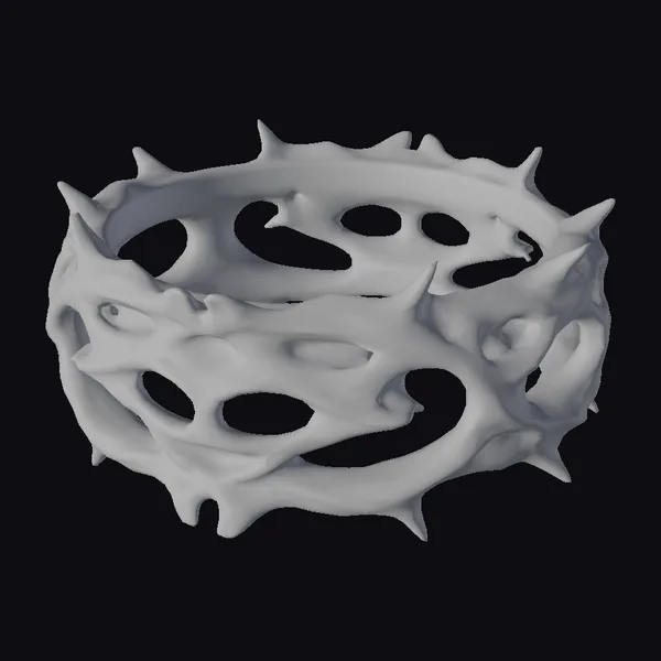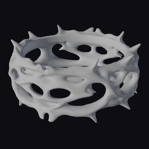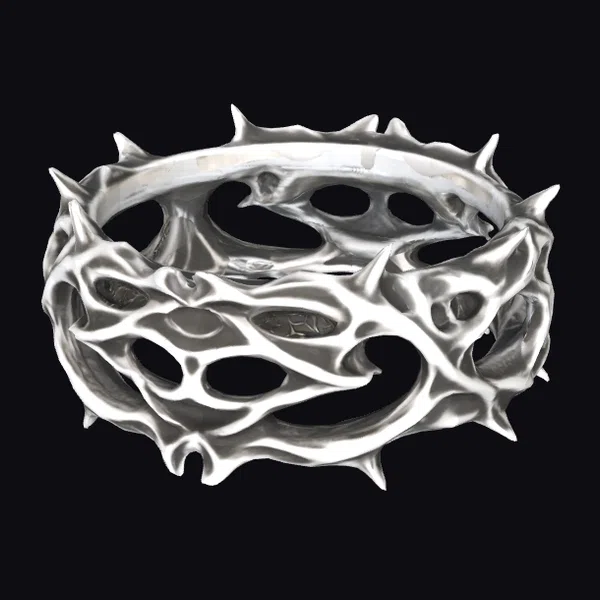 This intricately detailed thorned metal circle presents a mesmerizing blend of organic and industrial elements. Its surface gleams with a shiny metallic finish, accentuating the sharp, pointed spikes that protrude from its circumference. The circular form is interrupted by various oval-shaped openings, adding to its abstract, almost surreal appearance. Ideal for use in dark, gothic-themed designs, or as a statement piece in modern decor, this model can elevate projects in 3D printing, virtual reality, animation, and game design.