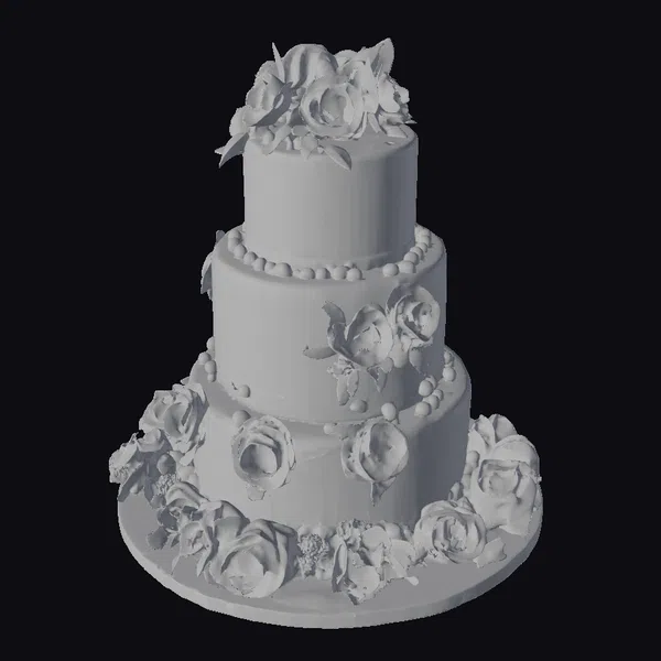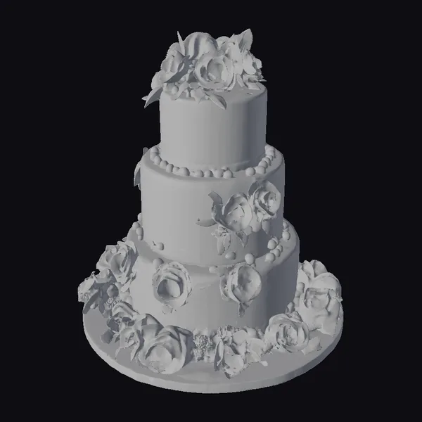 Standing tall with its three elegantly proportioned tiers, this exquisite cake model is a vision of sweetness and sophistication. The white fondant is meticulously detailed with delicate flower arrangements and lush green leaves, predominantly in shades of pink, with accents of yellow and purple. Each tier is separated by a decorative border of small white pearls, adding a touch of whimsy and romance. The cake sits on a round, flat surface, with flowers spilling over the edges, creating a dynamic and visually appealing scene. The model’s intricate details and realistic textures make it perfect for use in games, 3D print projects, VR/AR experiences, animations, and designs where a high-quality cake model is needed.