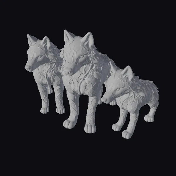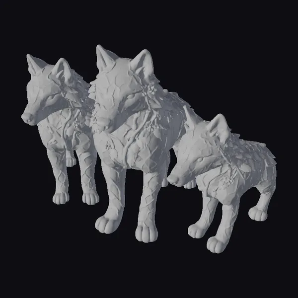 In a majestic pose, the three wolves are captured in a moment of serene vigilance. Their bodies are rendered in a detailed, stone-gray texture, with green vines snaking across their fur, punctuated by clusters of small, yellow flowers. The wolves’ eyes shine with a soft, luminescent glow, adding to their mystical aura. The model showcases exceptional detail, from the delicate petals of the flowers to the subtle play of light on the wolves’ fur. Ideal for use in fantasy games, animations, or as a striking decorative piece, these wolf guardians are sure to captivate audiences. Their unique blend of natural and magical elements makes them a versatile addition to any project.