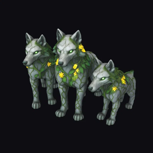 In a majestic pose, three wolves stand united, their bodies adorned with lush green vines and bright yellow flowers. The wolves’ gray fur features a subtle texture, while their eyes glow with an ethereal green light. The vines wrap elegantly around their necks and bodies, with small yellow flowers adding a pop of color. These fantastical creatures are perfect for adding a touch of magic to games, animations, or 3D designs. Their serene expressions and harmonious blend with nature evoke a sense of wonder and mystique.
