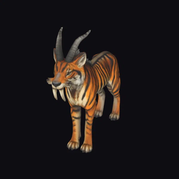 Standing tall with a powerful stance, this fantastical creature exudes an aura of untamed ferocity. Its body is a mesmerizing blend of tiger-like features, complete with vibrant orange fur adorned with black stripes, and the intimidating addition of two long, curved horns. The creature’s facial features are a highlight, with sharp, protruding teeth and piercing eyes that seem to challenge the onlooker. The texture of its fur, the detailed structure of its horns, and the menacing set of its jaw are all meticulously crafted, making this model perfect for use in games, 3D printing, VR/AR experiences, animation projects, and design visualizations.