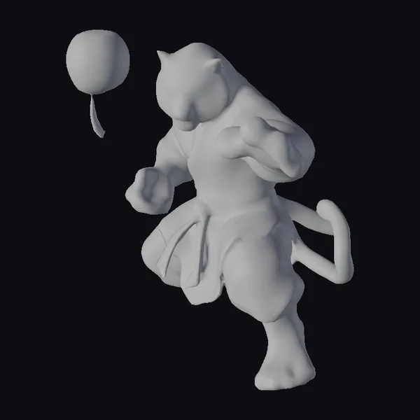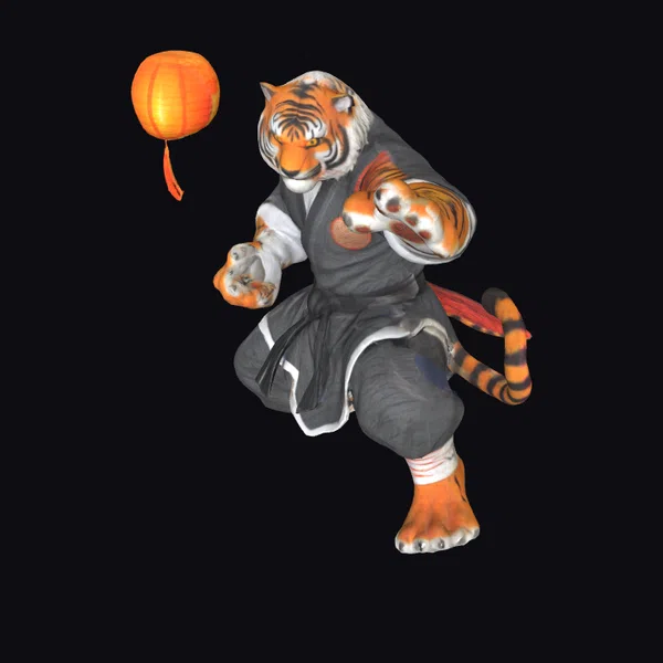 In a majestic pose, the tiger warrior appears to leap through the air, its stylized form blending human martial prowess with feline agility. The uniform’s fabric appears almost lifelike, with detailed folds and textures that catch the light. The tiger’s fur is a masterpiece of texture, with each strand and whisker meticulously crafted. The serene glow of the lantern nearby adds a touch of warmth to the scene. Ideal for projects requiring a mythical, martial arts adept, this model is perfect for animations, games, or 3D printing. Its unique blend of human and animal characteristics makes it a standout addition to any fantasy or martial arts-themed project.