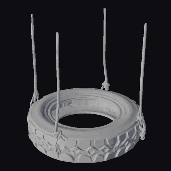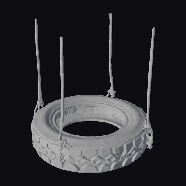 Suspended from four sturdy ropes, this tire swing appears ready to cradle its next rider. The tire itself is black with a worn, textured appearance, suggesting countless hours of use. The ropes, a natural tan color, are knotted securely to the tire, adding a sense of ruggedness. As the swing gently sways, it seems to invite all to take a seat and enjoy the simple pleasures. Ideal for outdoor scenes, playgrounds, or backyards, this model can be used in various applications such as games, 3D printing, VR/AR experiences, animation, and design projects.