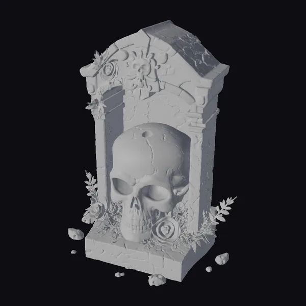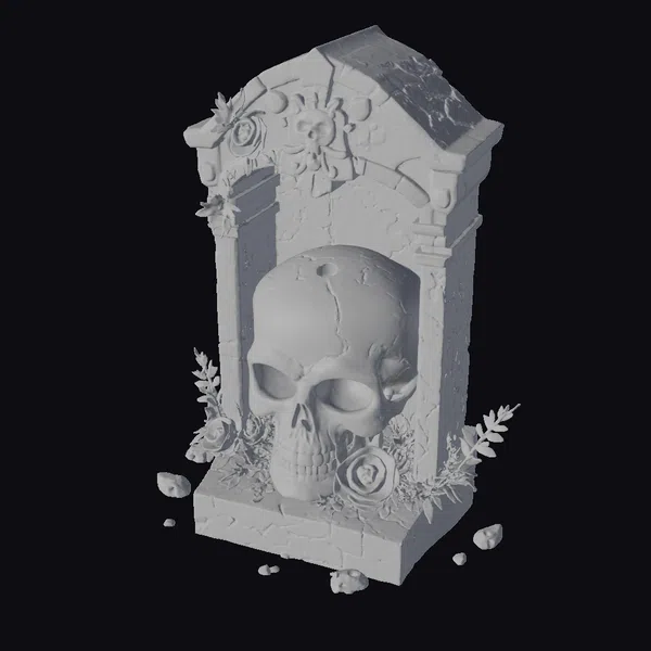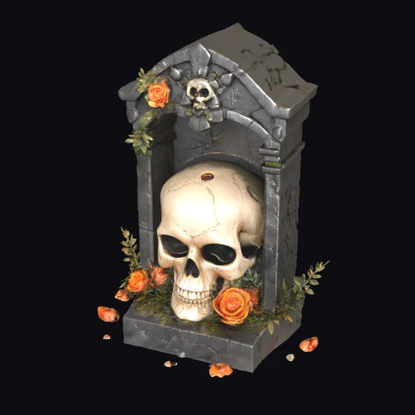 Perched atop a moss-covered base, the gray stone archway rises like a sentinel, its pointed roof and ornate details evoking a sense of foreboding. A smaller skull peers out from the apex, as if watching over the larger skull nestled within the archway’s recessed alcove. The skull itself appears worn, with cracks and crevices adding to its macabre charm. Delicate orange roses and scattered petals dance around the base, infusing the scene with a touch of melancholy beauty. This model is perfect for use in games, 3D printing, VR/AR experiences, animation, and design projects seeking a hauntingly beautiful centerpiece.