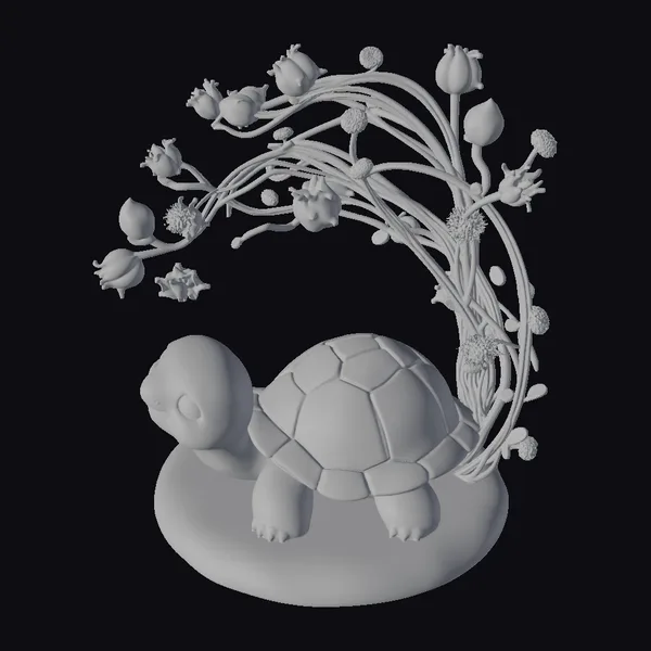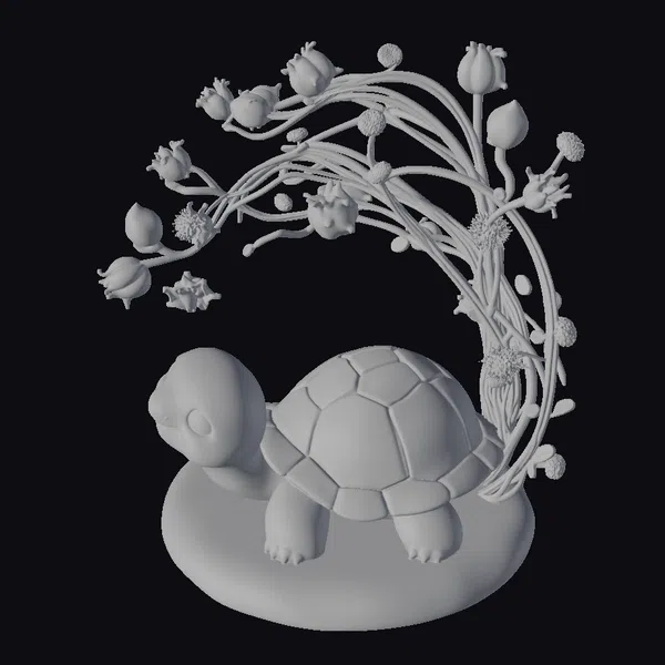 Perched on a smooth, rounded base, this enchanting tortoise figurine showcases a mesmerizing iridescent sheen on its shell and body, gradating through hues of blue, green, and pink. The prickly pear branch, curved above the tortoise like a natural arch, is dotted with buds and flowers in soft pink and green, adding a delicate, almost otherworldly beauty. The tortoise’s large, black eye sparkles with curiosity as it peers forward, its tiny legs and feet rendered in precise detail. This stylized model is perfect for artists, designers, and anyone looking to infuse their projects or collections with a sense of wonder. Ideal for use in games, 3D printing, VR/AR experiences, animation, and design projects.