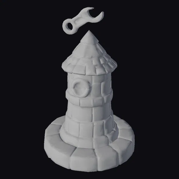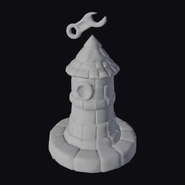 The tower’s design is a masterclass in whimsy, with a conical roof composed of neatly arranged, red tiles and a body made of stacked, tan stones. A circular window, framed in brown and emitting a soft blue glow, adds a touch of magic. The structure sits on a flat, circular base, also made of stone blocks, providing a sturdy foundation. A vibrant orange wrench appears to be floating above the roof, implying a moment of repair or maintenance. This model is perfect for scenes requiring a touch of fantasy architecture, such as games, animations, or virtual reality experiences. Its cartoonish style ensures it will stand out in any 3D environment.