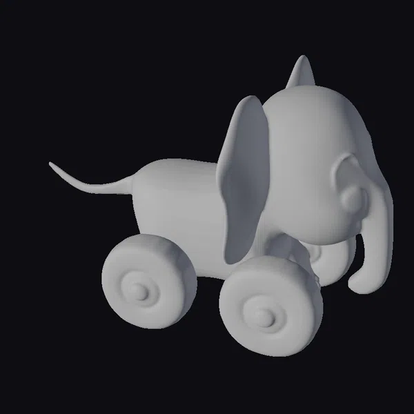 Gazing at this delightful toy dog, its large, expressive eyes and floppy ears immediately capture attention. The dog’s light brown body is mounted on four wheels, with the front wheels showcasing a striking red and black color scheme, while the back wheels mirror this design. A colorful object protrudes from the dog’s mouth, adding to its playful demeanor. Crafted with meticulous detail, this model boasts a smooth texture and a lively appearance, making it perfect for 3D rendering in children’s games, animations, or even as a decorative piece in virtual reality environments. Its cartoonish style and bright colors ensure it will be a hit in any creative project aimed at kids.