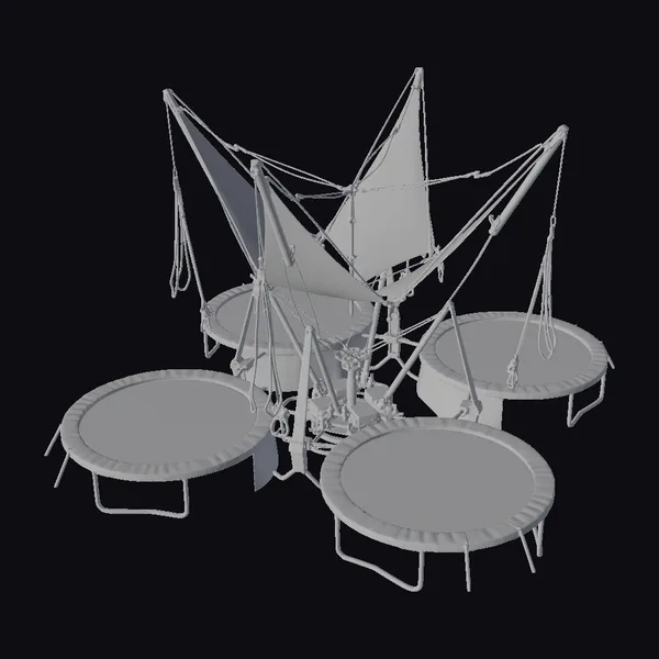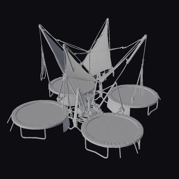 In a dynamic arrangement, four trampolines are interconnected by a complex bungee system, forming an exciting arena. Each trampoline boasts a robust metal frame, a black jumping mat, and protective blue padding around the edges. The bungee system, comprising red, yellow, and blue elastic cords, adds a pop of color and functionality. Strategically positioned metal poles and hooks secure the bungee cords, ensuring safety and stability. This setup is ideal for games, animations, or simulations requiring a lively, youthful atmosphere. Designers can use this model for various projects, such as outdoor recreational spaces, sports events, or even futuristic cityscapes.