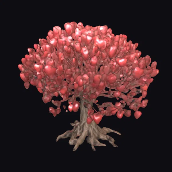 Standing tall with a sturdy, twisted trunk that splits into numerous branches, this tree is a marvel of stylized design. The trunk’s rough texture and the sprawling roots that anchor it to the ground provide a natural, earthy base. The tree’s canopy is a kaleidoscope of red heart-shaped fruits, each one uniquely shaped and glistening with a subtle sheen, as if kissed by the sun. The hearts vary in size and are scattered across the branches, some nestled deep within the foliage while others peek out, as if beckoning to be noticed. This tree model is perfect for projects that require a touch of whimsy and romance, such as animations, games, or architectural visualizations aimed at conveying a sense of love and unity. Its detailed textures and vibrant colors ensure it stands out in any 3D environment.