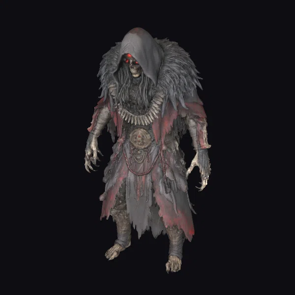 Standing with an air of mystique, this full-body ragged tribal shaman undead ghoul wanderer is meticulously detailed, from the tattered edges of its cloak to the texture of its skeletal hands. The model’s undead shaman is draped in a dark, hooded cloak with frayed edges, complemented by a necklace made of bones that adds to its tribal and mysterious appearance. The skeletal face, illuminated by piercing red eyes, contributes to the overall eerie and dark fantasy vibe. This 3D model is perfect for projects requiring a character with a strong, haunting presence, such as games, animations, or virtual reality experiences.