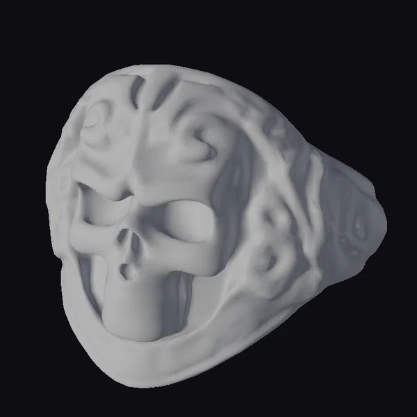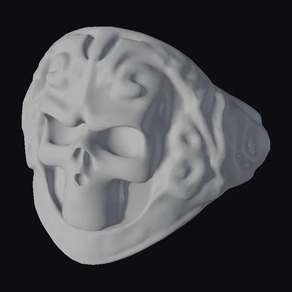 Positioned in a three-quarter view, this tribal skull ring showcases its detailed texture and ornate design. The skull’s surface is adorned with swirling patterns and a central protrusion, adding to its mystique. The empty eye sockets and ridged teeth contribute to its edgy appeal. This model excels in applications requiring a blend of horror and fashion elements, such as game character design, 3D printing for jewelry enthusiasts, VR/AR experiences, and animation projects. Its unique blend of darkness and artistry makes it a compelling addition to any creative endeavor.