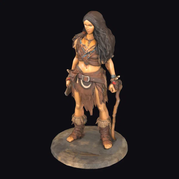 Rendered in exquisite detail, the tribal warrior’s pose exudes a sense of quiet confidence, her long, dark hair cascading down her back like a waterfall of night. Her outfit, a masterful blend of brown leather and fringe, is adorned with colorful tattoos and accessories that reflect her status and story. The earthy tones of her ensemble allow her to blend seamlessly into the wilderness, yet her gaze, cast downward, suggests a moment of contemplation or a challenge issued. The staff in her hand, sturdy and reliable, speaks of her readiness for battle or journey. This model is perfect for projects requiring a strong, tribal character, suitable for games, animation, print, VR/AR experiences, and design applications.