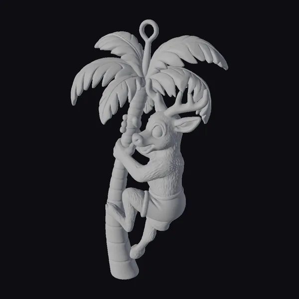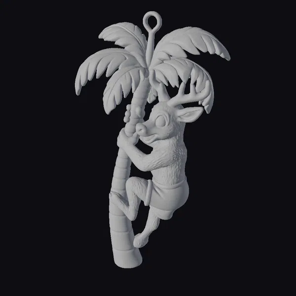 In a lively display of whimsy, a cartoon reindeer is captured in mid-climb on a sturdy palm tree, its red shorts a pop of color against the natural tones of the tree. The reindeer’s facial features are defined by large eyes and a wide smile, conveying excitement and happiness. The palm tree, complete with a loop at the top, boasts lush green leaves that add a burst of life to the scene. The reindeer’s pose, with one leg bent and the other extended, showcases its agility and playful nature. This charming scene is perfect for projects that require a touch of fantasy and outdoor adventure, such as animations, games, or decorative items. The model’s details, from the texture of the reindeer’s fur to the intricate design of the palm leaves, make it a delightful addition to any creative project.