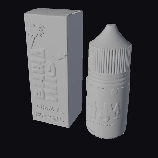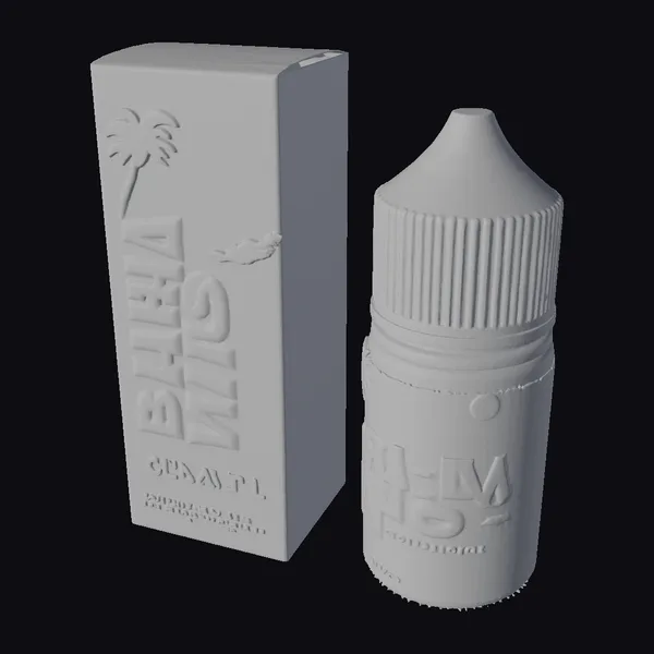 Perched on a crisp white background, the Bahamas Tropical Orange Vaping Liquid set exudes a carefree vibe. The yellow box, adorned with pink palm trees and a stylized map, stands upright beside its matching bottle. The bottle itself boasts a ribbed gray cap and a label featuring bold, pink typography that wraps around its curved body. As the eye moves around the model, the play of light on the bottle’s ridges and the subtle sheen on the box’s surface invite the viewer to explore every detail. Whether you’re creating a 3D scene for a product showcase, animation, or virtual reality experience, this model is sure to add a pop of color and a dash of tropical flair. Designers and artists can leverage this model for packaging design inspiration, product visualization, or as a prop in a larger 3D environment.