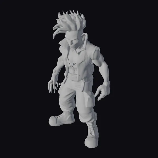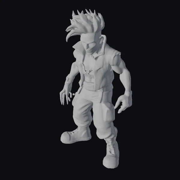 Detailed with precision, this stylized action figure stands in a dynamic pose, exuding confidence and power. The turquoise hair spikes upwards, while his glowing blue accents pulse with energy. His outfit is a testament to his bold personality – a black vest with a circular emblem, purple gloves, and pants with a metallic sheen. The glowing blue details on his gloves and pants add an otherworldly touch. Perfect for games, animation, or print projects, this 3D model brings a burst of energy and excitement to any scene. His rugged boots and strong stance make him ready for action, whether he’s saving the day or striking a pose.