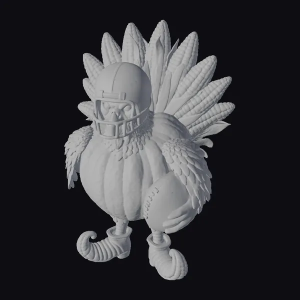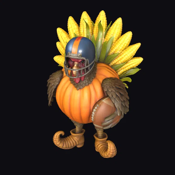 This vibrant, stylized model captures a turkey in a dynamic pose, wearing a blue and orange football helmet and holding a brown football under its wing. The turkey’s body is a large orange pumpkin, complete with a brown feathered neck and wings, and yellow corn forming a crown-like structure on its back. Its legs are adorned with curly, golden-brown boots. The model’s playful design makes it perfect for use in animations, games, or as a unique decorative element for Thanksgiving-themed projects or sports-related content.