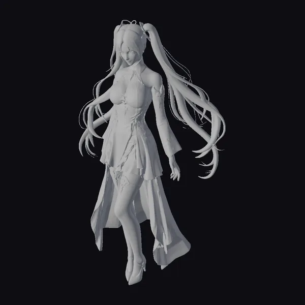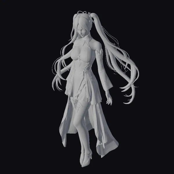 Rendered in a vibrant, stylized aesthetic, this character model showcases a female avatar with a mesmerizing turquoise hue dominating her long, flowing hair and dress. The avatar’s pose is dynamic yet graceful, with her weight shifted onto one leg and her arms relaxed by her sides. Her facial features are finely detailed, with a subtle, enigmatic smile playing on her lips. The outfit is a marvel of detailed design, with semi-transparent overlays and luminous accents that suggest a blend of fantasy and futuristic elements. The model’s high heels add a touch of sophistication, completing the look of a character straight out of a fantasy or anime universe. This model is perfect for projects requiring a blend of fantasy, elegance, and a touch of the extraordinary, such as animations, games, or virtual reality experiences.
