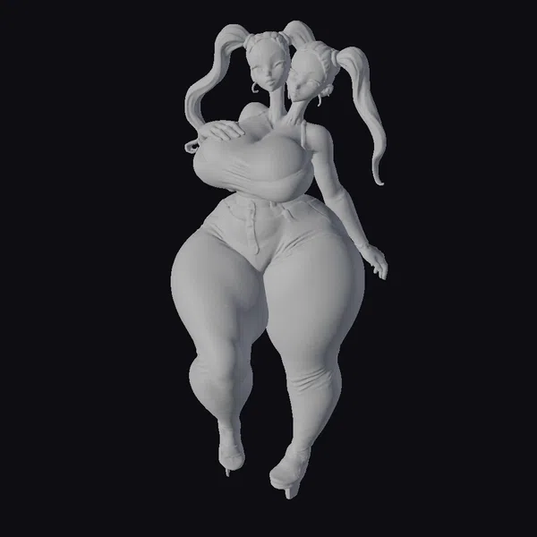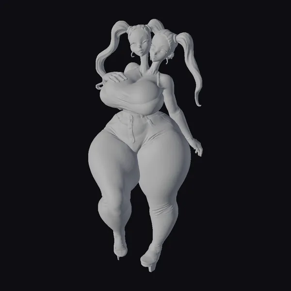 Detailed examination reveals a character with two heads, each boasting a white face with dark eye makeup and blue ponytails that flow dynamically. Her body is a vibrant blue, with a curvy figure accentuated by a glossy texture that catches the light. She wears a daring outfit that includes high heels, adding to her striking presence. This model is perfect for projects requiring a unique, sci-fi character, such as animations, games, or virtual reality experiences. Its stylized appearance offers a versatile asset for designers seeking a bold, eye-catching element.