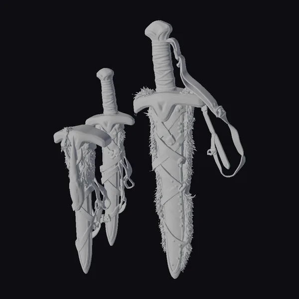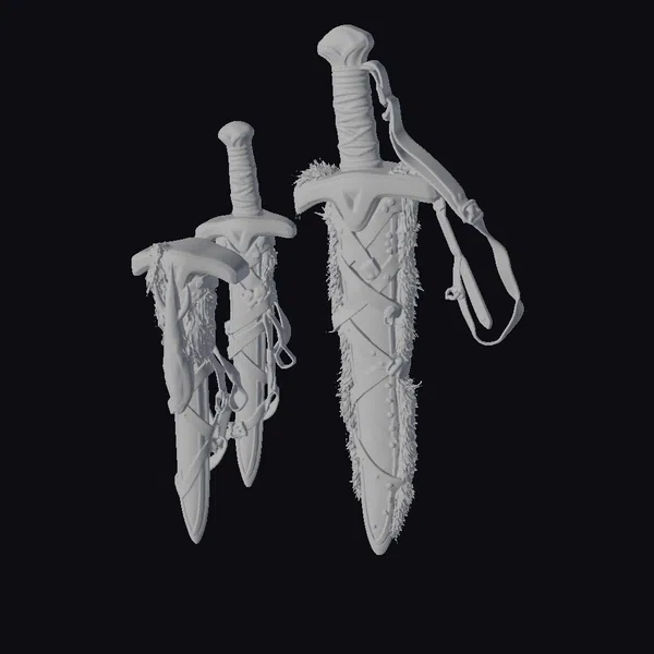 The Twin Swords of Valor stand poised, their dark metallic blades reflecting a storied past. Wrapped in worn leather and nestled in detailed scabbards adorned with frayed fur edges and crisscrossing leather straps, these swords tell tales of valor and conquest. The hilts, crafted for a secure grip, are complemented by intricately designed guards that add to their mystique. Whether destined for the hands of a brave warrior in a game, a hero in an animation, or as a detailed prop in a virtual reality experience, these swords carry an aura of heroism and ancient lore. Their presence in any scene is sure to evoke a sense of epic quests and legendary battles.