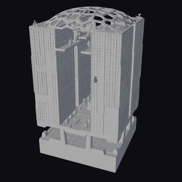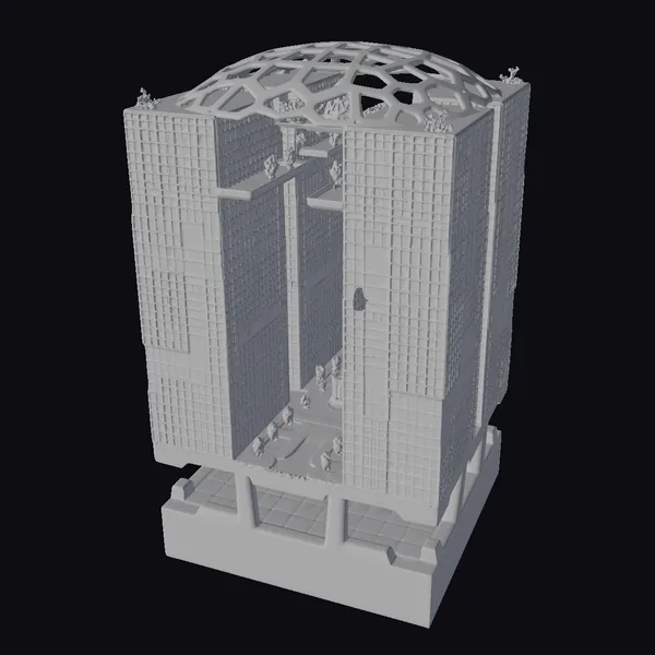Perched atop a sleek, modern base, this intricately detailed model presents a futuristic city block with two striking towers that seem to defy gravity. The towers’ exteriors are a marvel of modern architecture, with hundreds of windows reflecting shades of blue and gray, interspersed with white accents that add a touch of sophistication. A distinctive geodesic dome, covered in a vibrant green latticework and dotted with small plants, crowns the structure, creating a striking contrast between technology and nature. As light dances across the model’s surface, the reflective glass facades shimmer, adding a dynamic quality to the overall design. This model is perfect for use in games, 3D printing, VR/AR experiences, animation projects, and architectural design, offering a unique blend of style and innovation.